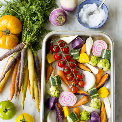 Either melt some coconut oil in an oven tray in the oven for 15 mins first or just coat coconut oil all over your lovely cleaned and cut vegetables. Season well with salt & pepper before roasting it for half an hour – forty five mins at 180c with your other trimmings and bits like a roast chicken. I always add some hardy herbs such as rosemary or thyme just 15 mins towards the end of the roast for the extra zing of flavour.