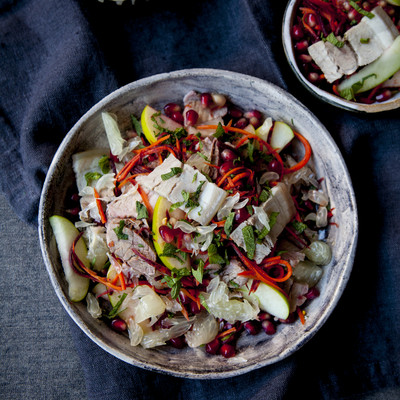 In a mixing bowl, mix together the apple and pomelo with the carrot, and scatter with the sliced mint leaves and pomegranate seeds. Layer over some of the pork slices and the dressing. Serve immediately.