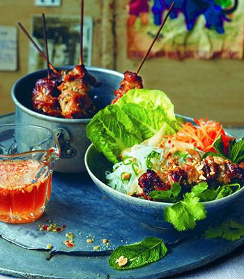 - For the noodle salad put the rice vermicelli, a pinch of salt and a dash of vinegar in a bowl or pan of boiling water, cover and allow to cook for 5–10 minutes or until soft. Drain and rinse with hot water. Mix together the herbs, lettuce and cucumber and divide between 4 bowls. Add the noodles, pickle and pickled leeks, if using, on top. Scatter the peanuts over everything. Serve with the pork skewers and dipping sauce.