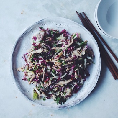 6 Shred the chicken from the bones. Discard the skin. Mix the meat with the onion pickle (discarding the juices), mint, coriander and pepper. Serve at room temperature with the rice and dipping sauce.