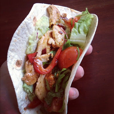 Heat one teaspoon of olive oil in the same pan and brown off the chicken in batches. Once browned off, mix all the chicken and the peppers in the pan with the remaining chili, the cumin, two tablespoons of water and a squeeze of lime. Cook whilst warming the tortillas.