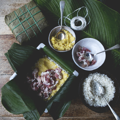 Place a centimetre layer of glutinous rice, spreading it up the sides of the then add a layer of mung bean paste. Season with salt. Add another centimetre of glutinous rice to the sides then place a layer of pork belly, season with salt and pepper, then a layer of mung bean paste again, season with salt. Make sure all the sides are covered with glutinous rice. Lay the final layer of glutinous rice on top and push everything down tightly.
